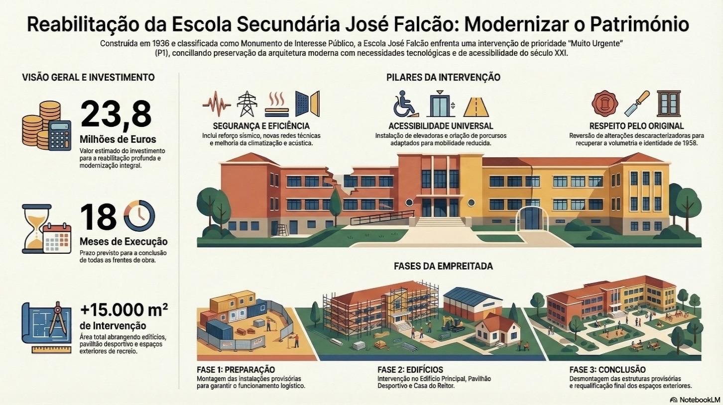 A informação técnica partilhada na sessão, acompanhada dos competentes anexos, detalha o plano de reabilitação profunda da Escola Secundária José Falcão, em Coimbra, um monumento de interesse público inaugurado em 1936. O projeto de execução, orçamentado em cerca de 23,8 milhões de euros, visa modernizar as infraestruturas e garantir a acessibilidade universal através da instalação de elevadores e novas rampas.